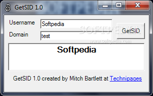It is a simple tool to use. Simply enter a username and a domain and GetSID will find out what the SID for the username is on a Microsoft domain network.System requirementsMicrosoft .Net Framework