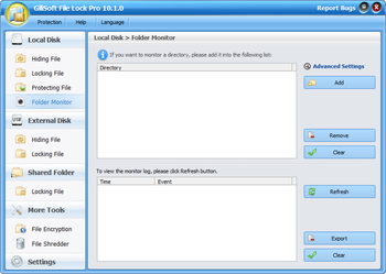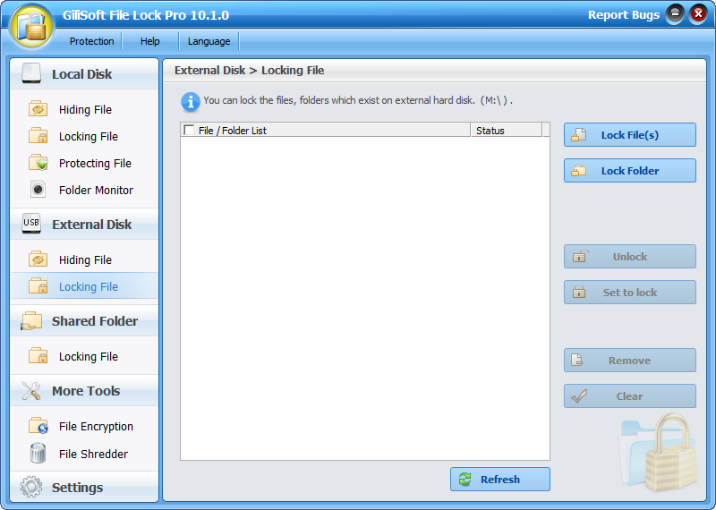 No matter if you are a businessman, an employee, a student, or even a housewife, a computer can assist you in your routine work. With it you will never worry about data theft by malicious behavior and privacy leaks.Lock folders on internal hard drive, flash drive, external USB drive, thumb drive, memory card, pen drive, and network drive. Encrypt files, folders; Hide files folders and drives; Make files folders and drives read only; Password protect files folders and drives. Gilisoft File Lock Pro is available in Chinese, Czech, English, French, Italian, Japanese, Portuguese. Hiding Files/Folders/Drives.Hide your private files/folders from local disk or external (USB) disk, completely invisible to anyone or any programs even under Windows Safe Mode. Make your private data unsearchable. All hidden files are never shown in search results.Locking Files/Folders/Drives.Password protect any type files/folders on local disk or external (USB) disk, password protect a folder so all new files added become password protected also.Protecting Files/Folders/Drives.After protect the files/folders on local disk, people can read the write-protected files, but nobody can modify, delete (even shift delete), or rename it without password.Folder/Disk Monitoring.Monitor a disk or a folder and its sub-folders when changing and writing or any operations or changes make by a user.Locking LAN Shared Folder.Windows doesnt have a built in feature which allows you to lock access to a folder via a password. With GiliSoft File Lock Pro, you set passwords for your folder shared on network that limit access to them.File Encryption/Portable Encryption.Encrypt files and folders into GFL format or EXE format file with AES encryption algorithm. You can open EXE encrypted files or folders on other computer.File Shredder/Disk Wiper.File Shredder has been developed as fast, safe and reliable tool to shred your company files. It also has integrated Disk Wiper which uses shredding algorithm to wipe unused disk space.Exclude List.There are system files or program you can not lock, you can use this exclude list to filter out them. You can use Program Log to view all history of operations.Self-protection Mode.Nobody can uninstall this software without password and you can hide this program in Invisible Mode. When someone enters wrong password more than 5 times, it will send alarm notifications to your pre-defined e-mail and the unknown login will be temporarily banned.