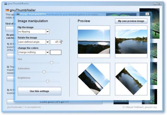 GnuThumbnailer is a thumbnail generator and an image batch processing tool. Create thumbnails which can be used to build a website gallery. The application can also be used to edit multiple photos with a few clicks. Features include create fixed size thumbnails to crop the edges of the images, create fixed size thumbnails which are not cropped instead of cropping and colored borders are added to the thumbnails, create scaled thumbnails and set a maximum width and a maximum height for the thumbnails, flip and rotate images by a user-defined angle, rotate images automatically if they contain EXIF data, colors of images can be overlaid, function can also be used to make images lighter or darker, add a colored or a transparent border to your images, and add a water sign to your pictures.