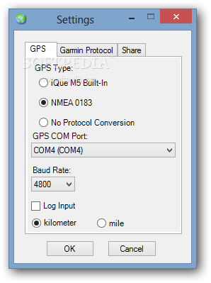 You can change the GPS COM port and adjust the baud rate. The application provides support for the Garmin protocol and enables you to configure the movement threshold and the DOP to accuracy multiplier. The map can display distances either in kilometers of miles.