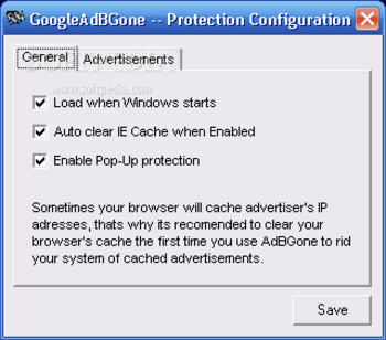GoogleAdBGone is a useful, small yet powerful piece of software which runs in the background, blocking popup ads before they are displayed, and replacing those annoying internet advertisements (banners, logos, javascripts, flash ads, google ads, sponsored search links, etc.) with the GoogleAdBGone logo, solid background, or some raw HTML of your choice.