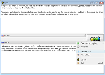 goot features a plugin model and comes with a Google Translate plugin for translating single words and whole sentences. It supports all the language combinations Google supports and can also autodetect which language the source text was written in.