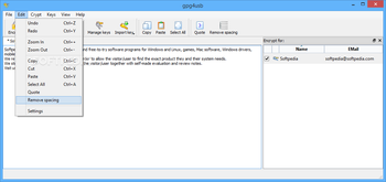 What's more, you can perform basic editing operations (copy, paste), remove linebreaks, use hotkeys for a better control over the entire process, remember passwords, import files which are dragged and dropped on the keylist without confirmation, as well as print the information.