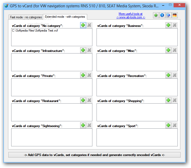 This way you can use these vCards for example, in compatible car navigation systems. Among others, the following navigation systems of the Volkswagen group are compatible: VW/Audi RNS 510/810, SEAT Media System and Skoda RNS Columbus.