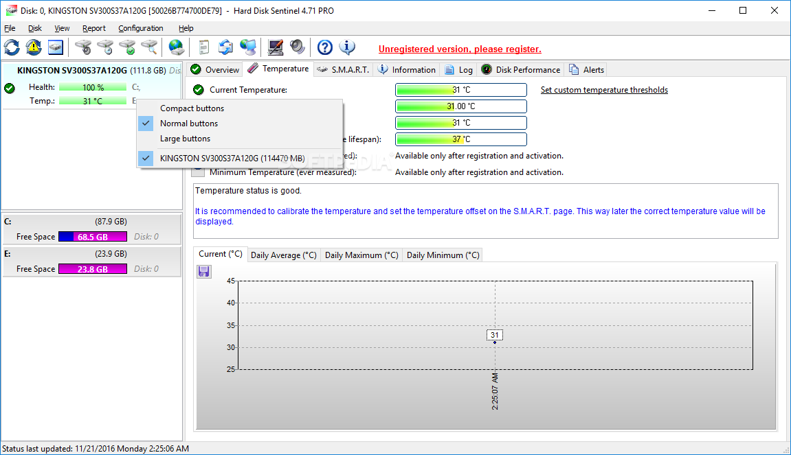 Current hard disk temperatures and health are displyed on the system tray and can be displayed in a small status window, the desktop itself or in a sidebar gadget (under Windows Vista or newer operating system). Average and maximum temperatures are logged for all hard disks and this information is displayed in graphs for statistical purposes.