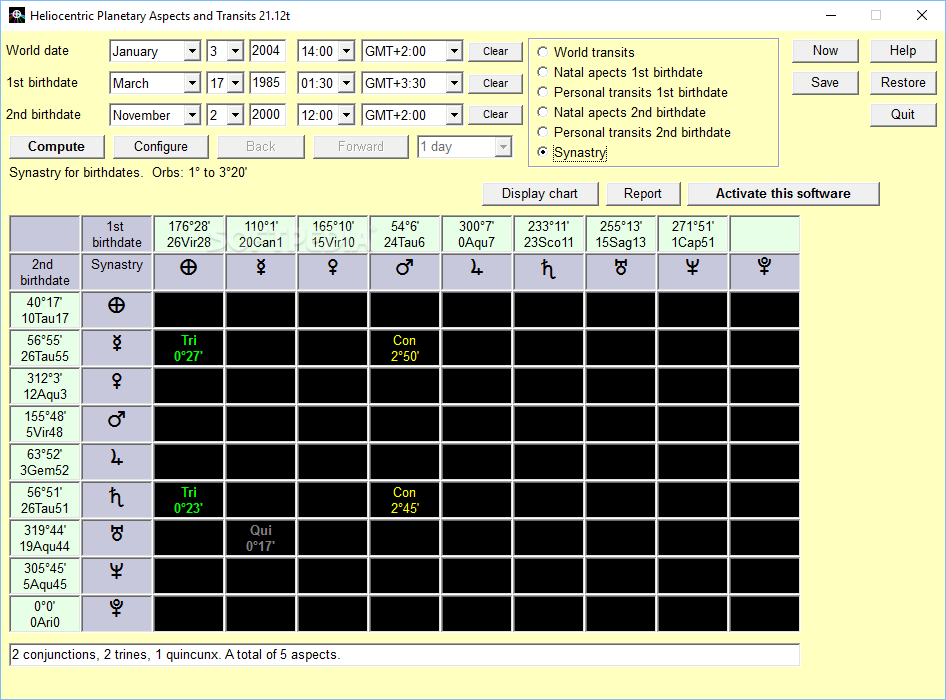 Heliocentric Planetary Aspects and Transits is an application aimed at both amateur and professional astrologists who wish to explore world transits and personal transits, generate natal charts for a certain birth date and analyze synastry between two people’s birth dates.