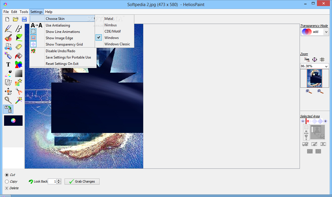 You can use HeliosPaint in order to create artistic composite photos, by applying parts from the source photo to the base canvas, with the help of the brush, lasso selection tool or the shapes. You can toggle transparency, as well as brightness, contrast or color balance in the photo.