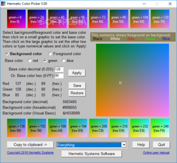 Hermetic Color Picker is a free software by Hermetic Systems and works on Windows 10, Windows 8.1, Windows 8, Windows 7, Windows XP, Windows 2000, Windows 2003, Windows 2008, Windows Vista, Windows 2012.