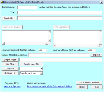 Windows software for indexing and searching Word docx files, HTML files, text files or files of a similar kind in any folder of a hard disk, CD-ROM. It indexes every word in every file, and any file containing a particular set of words can quickly be found by searching for those words. It consists of two modules: An index module used to create an index of the searchable files, and a search module used to search those files.