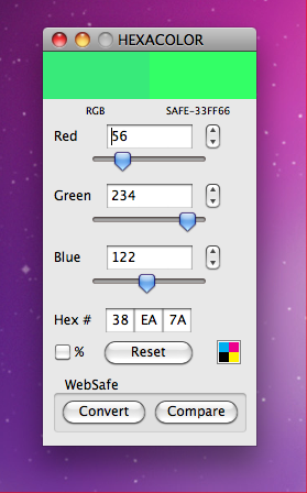 Easily allows you to convert any color value to websafe Hex, even CMYK values if your system colour picker supports it. Allows you to compare side by side your original color and the websafe one. Also converts those RGB% colors to RGB 0-255 values. You can mix a colour live and see how it will appear on screen.
