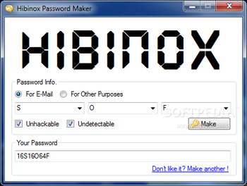 Hibinox Password Maker is a small software application developed specifically for helping you create secure passwords for your email accounts or other purposes. It can be installed on all Windows versions out there.