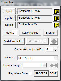 CONVOLUTION: combines the shared frequency spectra of two files by passing one "through" the other. Includes features to allow for reverb simulation using impulse response files.