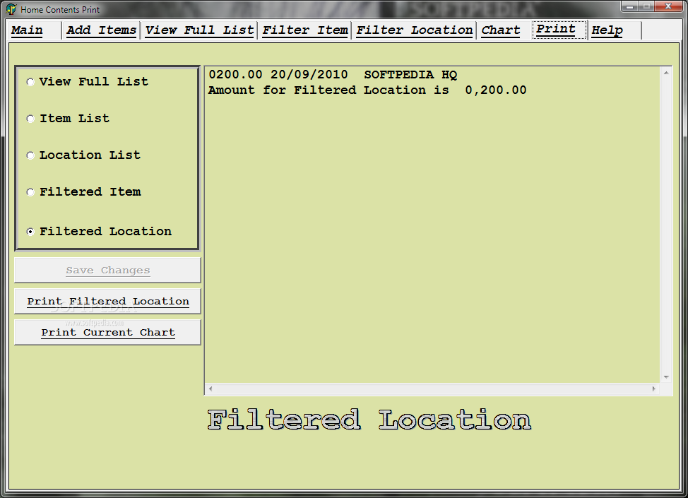 You can print location or certain categories of items. All in all, Home Contents is a small but useful software solution that allows you to create an inventory of items in your home.