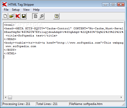 You can view and edit the source code, as well as set up the tags to keep, remove and empty. The status bar shows the processing and total lines, along with the filename. Moreover, you can easily toggle the HTML and tag setup mode.