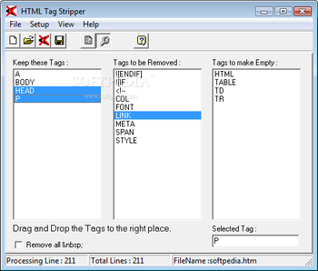 HTML Tag Stripper is a simple-to-use application that comes packed with options for removing tags from HTML files. It doesn't require installation and lets you save the modified files.