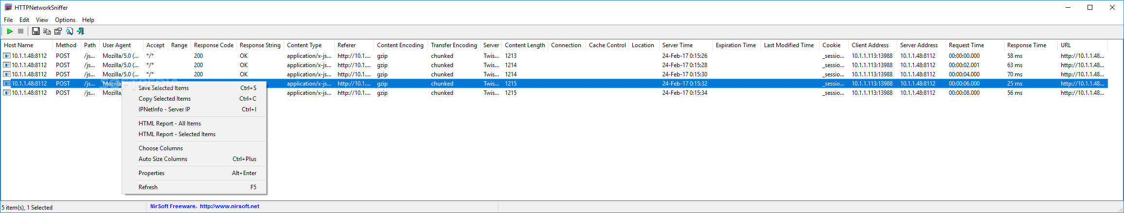 In the particular case of HTTPNetworkSniffer, the grapical user interface helps you a lot by drawing a rather intuitive window that encases each and every important bit of its functionality. Moreover, you can rapidly and effortlessly utilize the context menu of the items that keep popping in it as soon as you turn the sniffer on, in order to save and copy them as well as create HTML reports or perform actions related to columns.