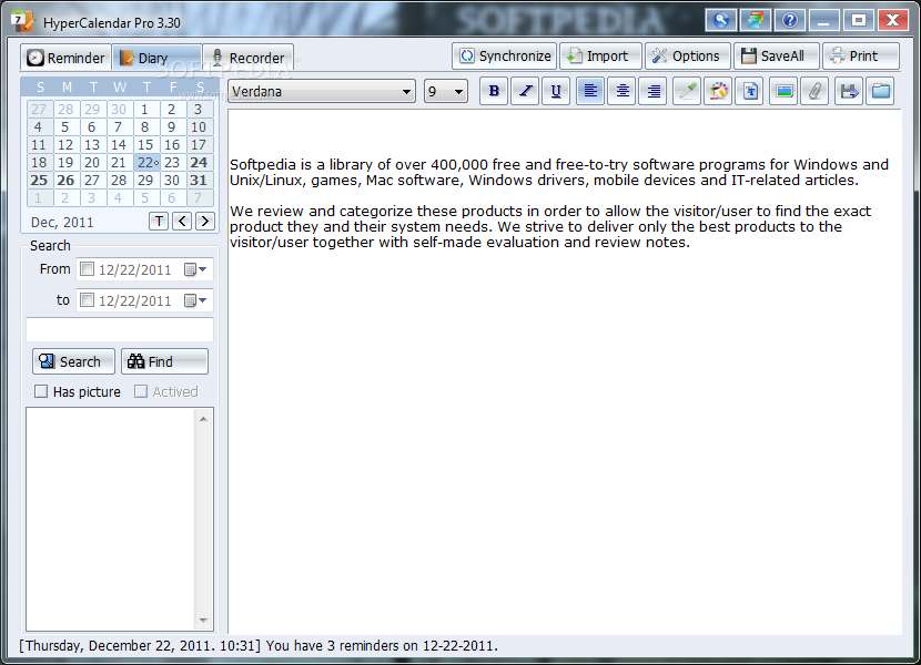 You can easily select to export a diary to RTF file or import a RTF to your diary. Also, you can pint out the content of your reminders or diaries.
