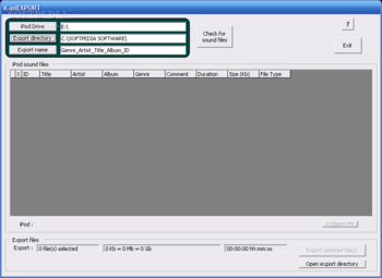 iCanEXPORT is a free software for exporting music from your iPod to your PC. If you have legal sound files (mp3, wav, aac) in your iPod, now you can export them to your PC. For example: music that you produced, that you bought and have the legal permission to copy. If you have formatted your PC and lost these music, now you can download them from your iPod.