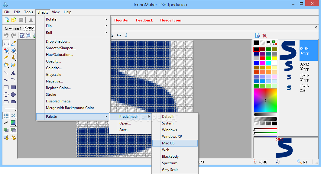 Create and edit icons in either standard or custom sizes, in color depth up to 16 million colors