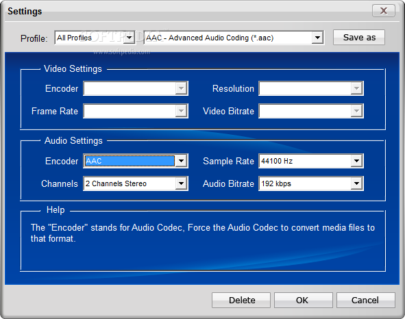This tool supports AAC audio file as the source and destination format, and can convert AAC to/from all popular video and audio formats, including AVI, WMV, DivX, MP4, H.264, MPEG, RMVB, MOV, FLV, MP3, AC3, M4A, OGG, WMA, and so on.