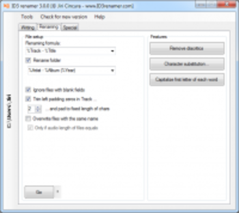 ID3 Renamer is used to rename a large number of files in a directory accordingly to their ID3 description and a given "formula" (e.g. (%Track) %Artist - %Title). Such a function is pretty "smart", as it lets you assembly the filename as you wish and use the variables from the ID3 tag in the filename. You can also fill ID3 tag with some smart functions.