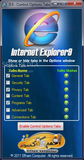 IE9: Control Options Tabs is a free software by Efham Computer and works on Windows 10, Windows 8.1, Windows 8, Windows 7, Windows XP, Windows 2000, Windows 2003, Windows 2008, Windows Vista, Windows 2012.