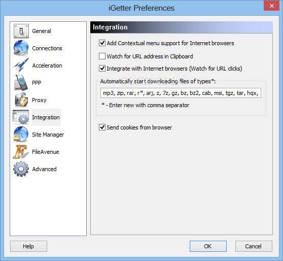 iGetter supports HTTP, Tunnel and FTP Proxies, and Socks Firewalls (4, 4a, 5).