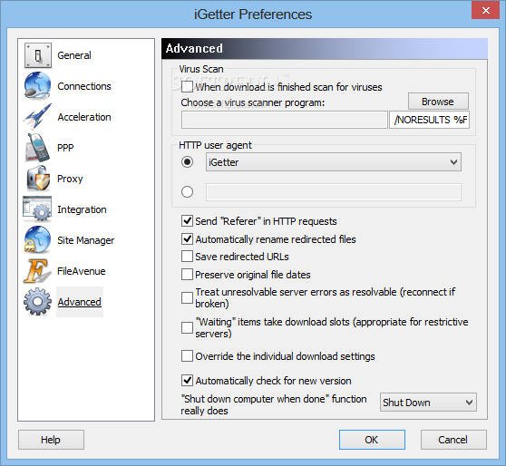 iGetter can Hang Up the PPP connection and Shut down the computer when all files in the queue are finished.