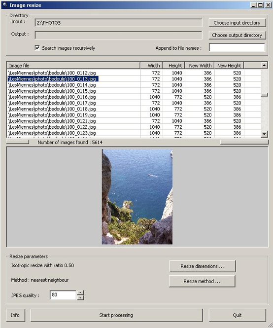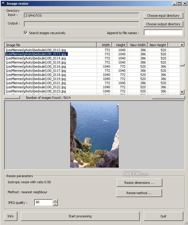 The software Image Resize is a tool to increase or decrease the dimensions of photos or images. This stands for a nice tools for making thumbnail or for ajusting the dimensions of your photos before a presentation on screen or projector. This is a necessary tool for those who make graphics, collecting photos or simply for those using a numerical camera. Image Resize is the only one software to be able to process 10, 100 or more than 1000 images with few manipulations. Image Resize scans recursively the directory you provided and finds all the images located on your hard disk, and processes the files without manual manipulation. You need only to tune parameters at the beginning. The heart of Image Resize is an accurate interpolation engine which respects the details of your images while resizing them. There are many possibilities for interpolations methods among them the so called bilinear and bicubic methods. These are the same methods used in Photoshop TM. Image Resize proposes also an innovating method : the biquadratic method which is a good compromise between quality and speed.