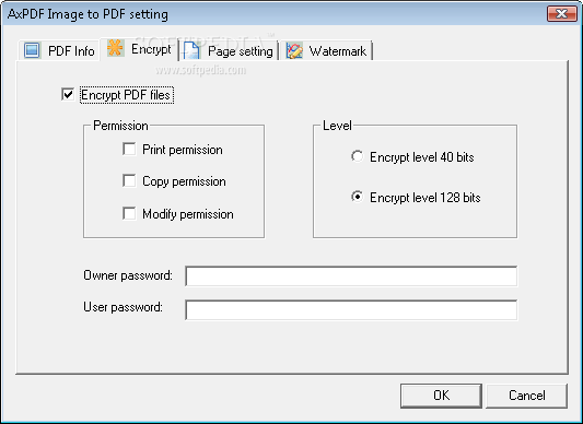 Encrypt PDF files: Give the PDF print, copy and modify permissions by 40 bits higher encrypt levels. Setup passwords for owner and users of modifying and reading authority.