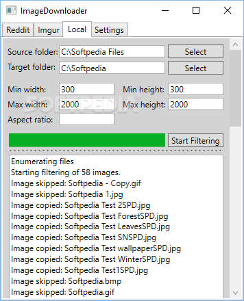 ImageDownloader is a compact application designed to help you grab images from Reddit and Imgur, as well as transfer files between local directories. It is fairly easy to use, and it lets you filter images based on several parameters, but it does look a bit unpolished.