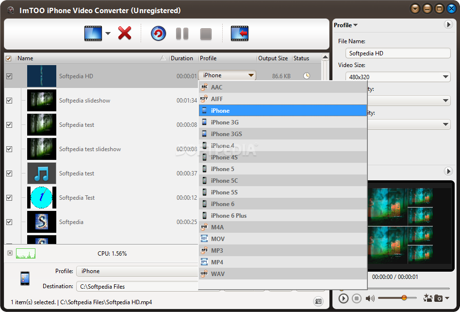 ImTOO iPhone Video Converter is a simple-to-use application which lets you encode media files to MPG, MOV, WAV, MP3, WAV, AAC and other media formats.