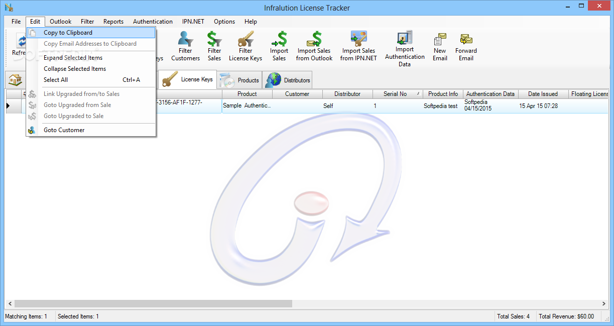 Infralution Licensing Tracker allows you to manually enter new customers, sales records, license keys, but you may also import the data from local files. You may transfer sales from specific files, straight from Outlook, or from IPN.NET. Authentication data can also be imported from an outside file.