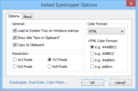 Instant Eyedropper is a free software by SpiceBrains and works on Windows 10, Windows 8.1, Windows 8, Windows 7, Windows XP, Windows 2000, Windows 2003, Windows 2008, Windows Vista, Windows 2012.