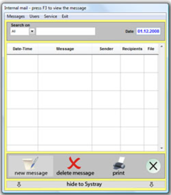 Program is intended for exchange messages and files on local computer network. You can attach 4 files of any format with message. There is possibility of the checking the reading the messages. The program works with exchange folders, you can assign the right of the access with Windows Server. The program consists of Server and Client part. Server part you must setup on server, Client part - on computers of the users.