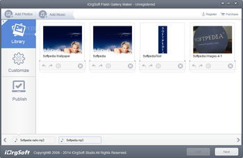 You start by adding the desired images and MP3 files to the library. iOrgsoft Flash Gallery Maker supports the most common graphic formats, namely BMP, JPG, JPEG and PNG, displaying thumbnails of all the pictures within the main window.