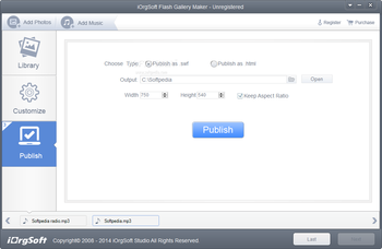 The application can generate both SWF or HTML files containing the created slideshow, making it easy for you to integrate the files within a webpage. You just have to adjust the width and height and press the 'Publish' button to generate the gallery.