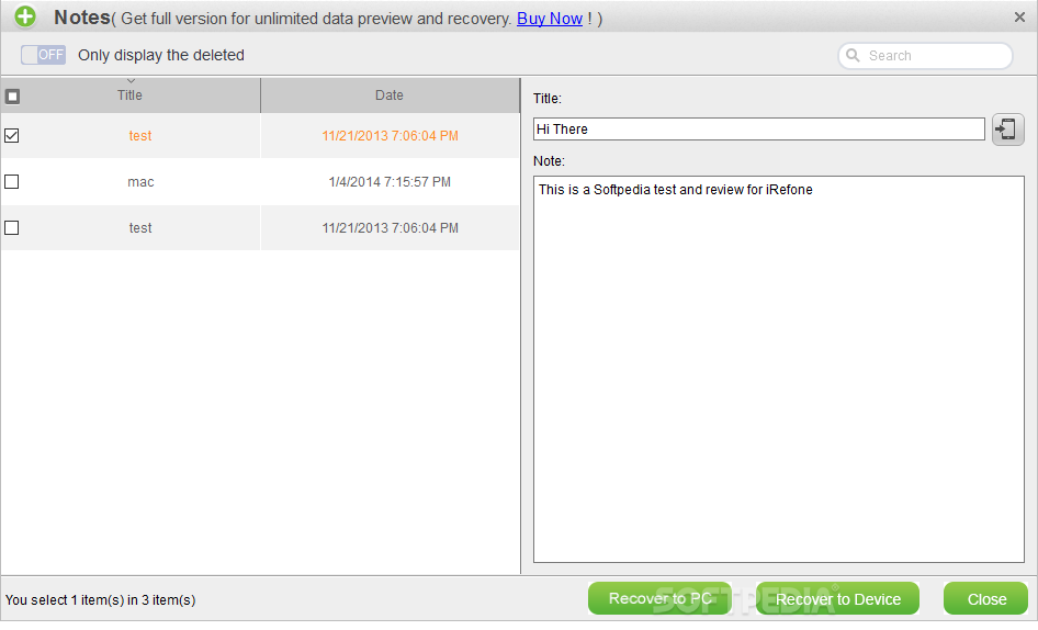 Clicking an item takes you one step further, where you can preview the data before recovering it to your computer or the iOS device itself. For example, you can check out previously deleted phone numbers, photos in thumbnails, together with titles and notes in the calendar. A search function is put at your disposal to help you quickly handle large amounts of data.