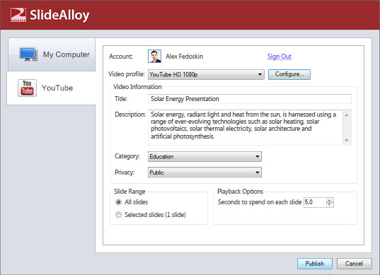Now its easy to spread your ideas throughout the world using the most popular video hosting. iSpring introduces iSpring River, the most up-and-coming PowerPoint to video converter that allows one-click publishing of your PPTs to YouTube.Many people really rock when it comes to PowerPoint. And they probably would love to share their awesome projects with the whole world. So why not share truly engaging content on the fly via the ultra-popular video hosting site, YouTube?With iSpring River, it boils down to simplicity. You open the River tab right in your PowerPoint, click "Publish", fine-tune the video output quality and voila.iSpring River accurately preserves all PowerPoint effects, including animations, transitions and even triggers. Your background audio will also keep working as in the original PowerPoint presentation. Enjoy high-quality video converted right in PPT and gain more and more likes on your YouTube account.
