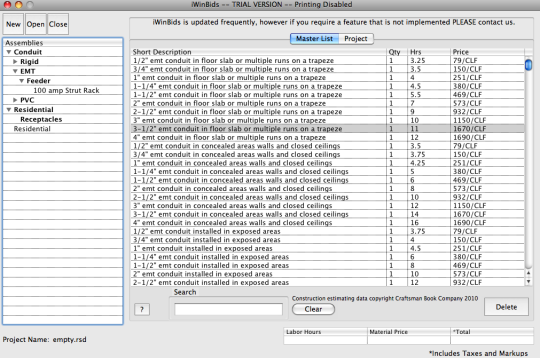 Electrical estimation software that not only takes material, and labor into the prices, but gives you the option to add phases, rooms, or dedicated employees to each object. Current database is around 9000 items, prices should very accurate, however with the ever changing market and how quick things are changed, some items such as copper, and conduit are hard to keep up with. As a user you will be able to add an unlimited amount of items and assemblies to your database. iWinBids will have automatic updates for those whom subscribe (purchase one year in advance) that will synchronize new prices with your database. New software versions are likely to appear quarterly. Many items that are available on some larger software is in the process of being added to our software. Items like, import jpeg, and highlighters will be linked to assemblies which you can then do a on screen take-off. Additional vendors soon to be added, along with municipalities that can contain all the inspector information.