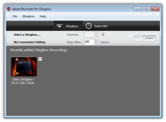 Recording Slingbox TV streams remotely from your PC has never been easier. Just pick a channel, set a schedule, and this Slingbox Recorder will tune into your TV and record automatically to your PC. Or, you can record instantly just by changing the channel and clicking the Start button.Looking for a super-easy way to record Slingbox TV streams remotely from your PC? Just install Jaksta Recorder for Slingbox, then pick a channel, set a schedule, and Jaksta Recorder for Slingbox will tune into your TV and record automatically to your PC. Or, you can record instantly just by changing the channel and clicking the Record button. Jaksta Recorder for Slingbox will automatically convert the recorded video into a media format of your choosing. Jaksta Recorder for Slingbox has preset conversions suitable for viewing recordings on your TV via DVD or media center playback as well as portable media devices such as the iPad, iPhone, Windows and Android devices. In all there is over 100 conversion presets to choose from - and advanced users can add their own!Setup is easy too: Just enter your Slingbox ID and password, and youre ready to record.Do you have multiple Slingboxs? Jaksta Recorder for Slingbox can record from multiple boxes at the same time!With the Jaksta Recorder for Slingbox scheduler, you can set up a recording to happen automatically at a time and day you choose. Even recurring events.Jaksta Recorder for Slingbox lets you pick the target format for your video or audio recordings. You can just choose a device (like iPhone, etc.), or a format, or customize one of the presets. If you use iTunes, your recordings can be saved there too.