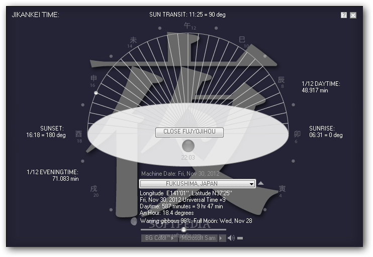 When the Sun transits on divided 30 degrees, JIKANKEI plays a signal of MIDI sound which is made by the Sun date of the chosen places.System requirementsInternet connection