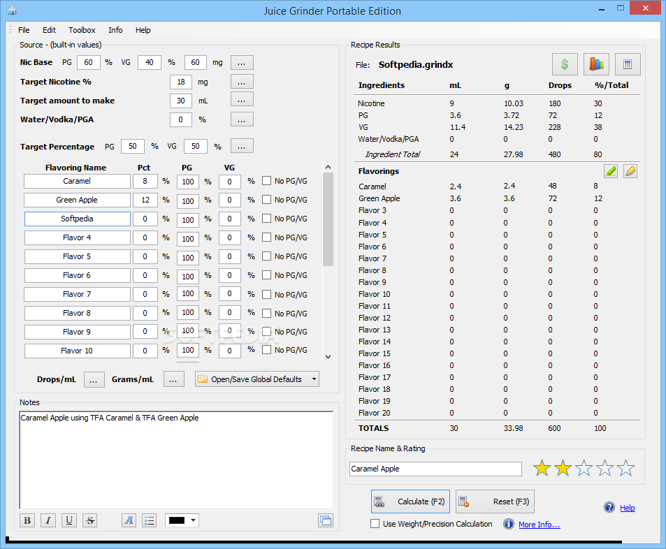 Juice Grinder Portable offers a series of specialized calculators which can help you estimate the amount of each flavor you wish to add, the nicotine base substances, Ohm’s law or ingredients adjustment. You may also add your own notes to each recipe, they are being saved/exported with the entire document.