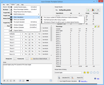 Juice Grinder Portable is a reliable program that allows you to create and modify recipes for e-juice, using specialized calculators. You can insert new ingredients in the recipe, such as flavors and calculate the exact quantity you need to add to the actual mix. Moreover, it can help you save the recipe to a local file.