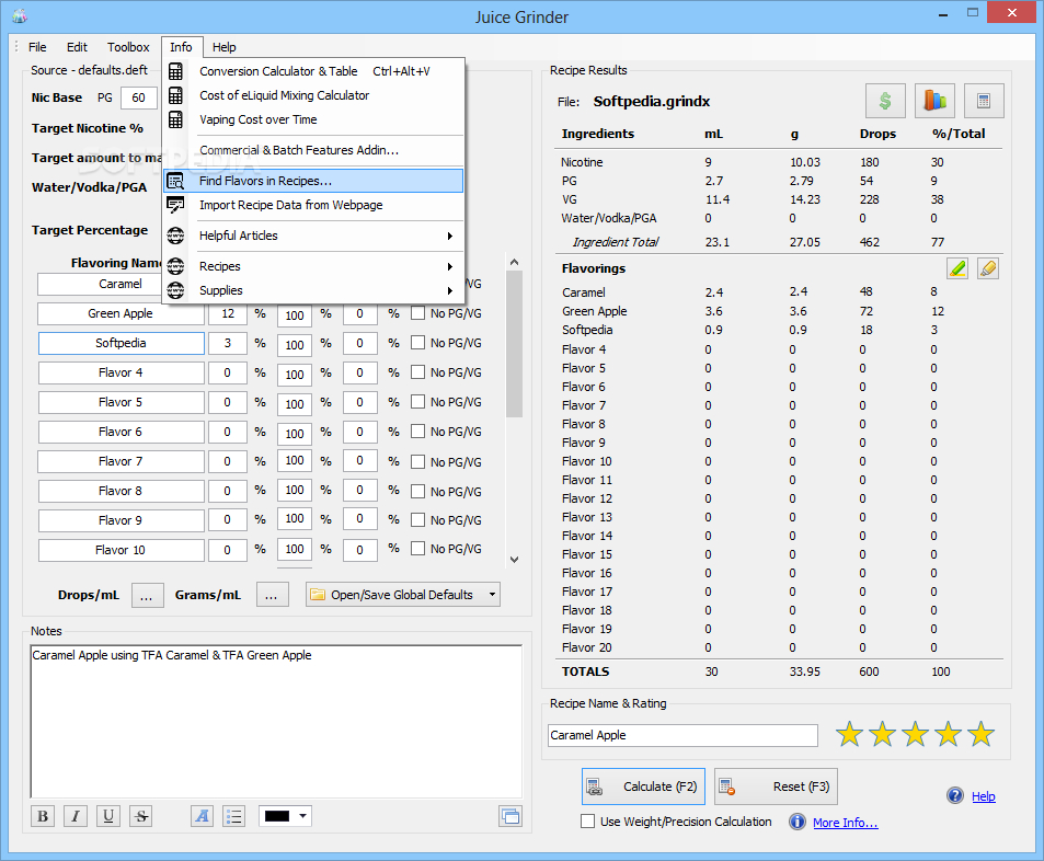 Juice Grinder is a reliable application which enables you to accurately calculate the amounts of ingredients you need in order to create your own recipe of eJuice. The application allows you to create a specific formula for up to ten different flavors, aside from the base ingredients needed to calculate the exact amounts. Create original eJuice recipes by yourself. Juice Grinder allows you to calculate the values for the base ingredients, as well as for the flavor elements. You can specify the amount of nicotine you wish the eJuice to contain, the total amount of eJuice you wish to create and the percentage of Water/vodka/PGA it should contain. Additionally, for each flavor, you need to specify the balance of PG and VG. The final recipe displays the amount of each of the five (or more) ingredients you need to add, in order to create your product.