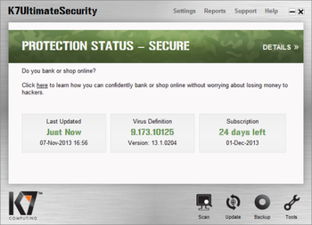 K7 Ultimate Security is a demo software by K7 Computing and works on Windows 10, Windows 8.1, Windows 8, Windows 7, Windows XP, Windows 2000, Windows 2003, Windows 2008, Windows Vista, Windows 2012.