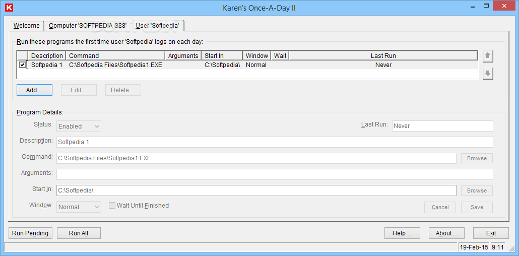 Creating a list of applications to be executed when a user logs in or when the computer starts can be useful, and while Microsoft Windows does provide some features to enable this type of automation, they are not as easy to configure as Karen's Once-A-Day.