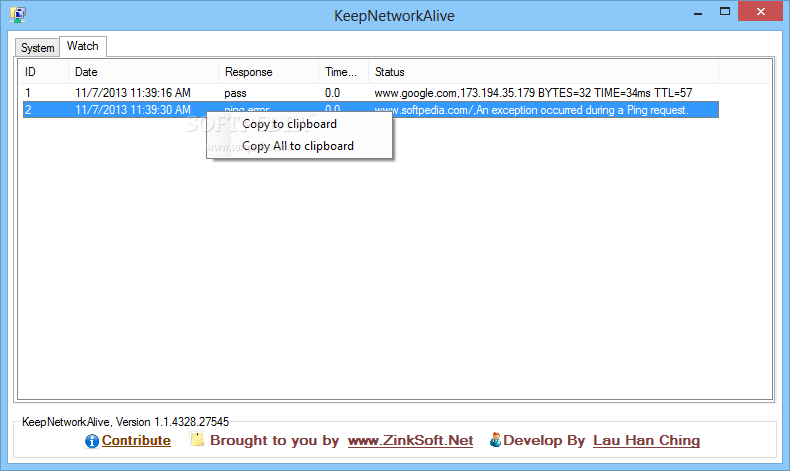 In a separate tab you can view the logging details, and they include the ID, date, response, time and status of each command. All or just selected rows can be copied to the Clipboard via the right-click menu. There are no other notable options provided by Keep Network Alive.