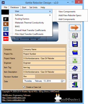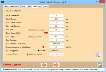 Kettle Reboiler Design is a demo software by WeBBusterZ Engineering Software and works on Windows 10, Windows 8.1, Windows 8, Windows 7, Windows 2012.