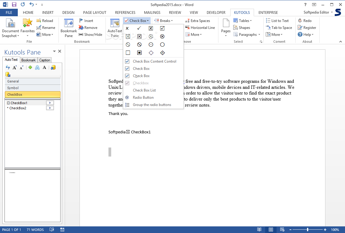 You can download Kutools for Word which is 14.4 MB in size and belongs to the software category Other Office Tools. Kutools for Word was released on 2016-10-27 and last updated on our database on 2017-04-16 and is currently at version 8.6.